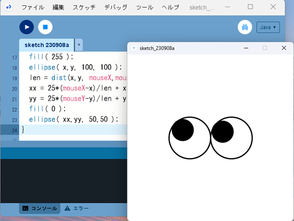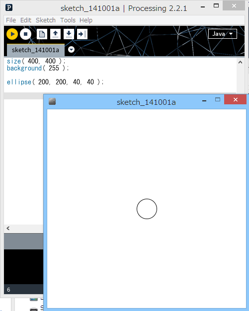 | ・ Processingの起動 - 以下の実行ファイル「processing.exe」をダブルクリックしてProcessingを起動する ![]() ・ プログラムの実行と停止 ![]() - 以下のプログラムを打ち込んで実行してみましょう <円を描く>