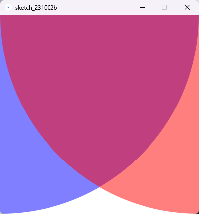 <演習3> 下図を描画しなさい。 Windowのサイズは 400x400, 2個の円の中心座標は(0,0), (400,0)であり、 円の直径は800である。(円は ellipse();で描画) 色について、左は青、右は赤で α値=128 を設定する。 ![]() 解答例 |