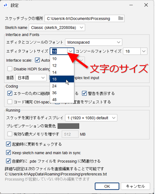 - size(400,400); //ウィンドウサイズを400x400 にする - background(255); //背景を白色にする - ellipse(200,200,40,40); //円を描画する ![]() <繰り返しを使って同心円を描画する例> ![]() ・ エディタの文字サイズを変更するには エディタの文字サイズを変更することができます。 メニューの [ファイル] --> [設定...] で、下記の「エディタフォントサイズ」を適宜変更してください。 ![]() |