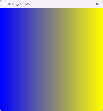 | ・ 色の指定(再掲) 描画などの色は3つのパラメータ R(赤色)、G(緑色)、B(青色)の成分を 0~255 で指定します。 ■ ( 0, 0, 0 ) ■ ( 255, 0, 0 ) ■ ( 0, 255, 0 ) ■ ( 0, 0, 255 ) ■ ( 255, 255, 0 ) ■ ( 0, 255, 255 ) ■ ( 255, 0, 255 ) ■ ( 255, 255, 255 ) ■ ( 255, 128, 0 ) ■ ( 128, 24, 160 ) ■ ( 60, 128, 32 ) ■ ( 128, 128, 128 ) ・ 色のグラデーション 色指定のパラメータを繰り返し(for文)と組み合わせて「色のグラデーション」を作ります。 基本的な方法は 0.0~1.0 の範囲で変化する変数を用意して 0~255 に変換した値を用います。 <黒色 --> 白色 のグラデーションを描画>