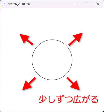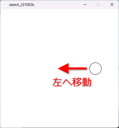 1秒間に、x は 60増加することになる <実行結果> ![]() <演習2> 上記のプログラムを、「〇が右端から左方向へ移動する」ように修正しなさい。 ![]() 解答例 <例:〇が少しずつ大きくなる>