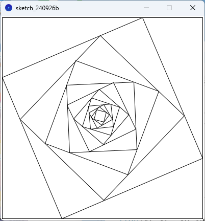 | 下図のように正方形が少しずつ小さくなっていくプログラムを作成しなさい。 ・ウィンドウのサイズは 400x400 とする。 ・正方形の個数は12個程度、rotate()やscale()は使わない。 ・配列はわかる人は使ってもよい。 ・下図の表示例において、内接する正方形の頂点座標は、 接する辺を 7:3 に分割するように計算している。 ![]() |