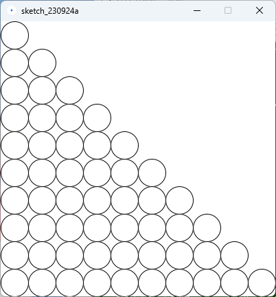 | 下図の描画をしなさい。 線と線の交点は長い方の線の中点として、線の本数は全部で10本である。 for文を使うこと。 ![]() |