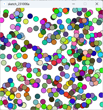 | <演習1>の400個の〇を描くプログラムを、色もランダムになるように修正しなさい。 <実行例> ![]() |