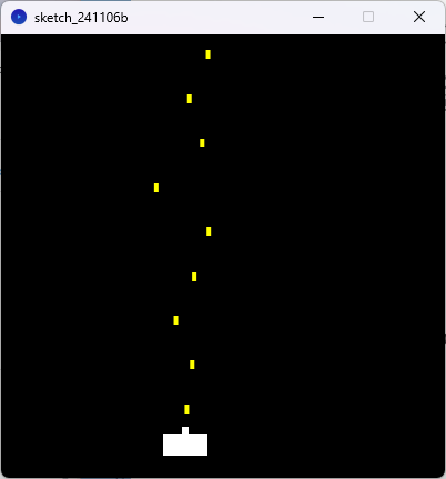 | 課題4のプログラムをさらに改良し、マウスボタンを押している間、弾が連続で発射されるように修正しなさい。 配列を使う必要があるが、例えば int [] a; a = new int[8]; for(int i=0;i<8;i++){ a[i] = i*2; } for(int i=0;i<8;i++){ System.out.print(a[i]+ " "); } とすると、実行結果は 0 2 4 6 8 10 12 14 と表示される。 さらに、発射された弾は少しブレるようにすること。 実行の様子は下記の動画を参考にしなさい。 実行例の動画 |