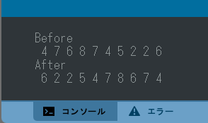 <実行例> <演習6> 整数の乱数(1~9)を10個発生させて配列 int [] x; に格納する。 次に配列の並び順を逆にする関数 void revArray(int [] a) を作成して、実行例のように表示する。 下記のソースの/*空欄*/,/*空欄(複数行)*/を埋めてプログラムを完成させなさい。 <ソース>