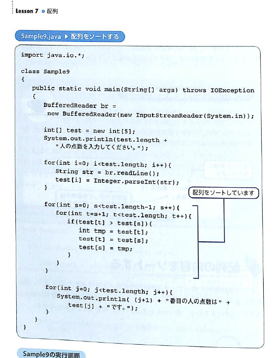 <実行例> <演習3> int [] x = {89,61,34,67,65,54,34,51,30,42,92,62}; を昇順に並び替えて表示する。 (Lesson7のSample9.javaを参考にすること)--> 切り抜きの画像 以下ソースの /*空欄(複数行)*/ および /*空欄*/ を埋めて、プログラムを完成させなさい。 <ソース>