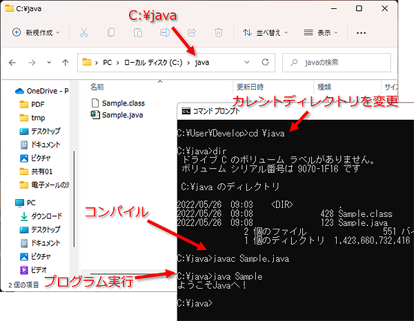 Javaの開発環境を整備する - 次回(第8回)以降は、JavaのJDK(Java Development Kit)を使います - JDKを自分のPCにインストールする必要があります - Javaは コマンドライン でコンパイル・実行する - コマンドラインの操作は「コマンドプロンプト」で行う(Mac はターミナル) ・JDKを自分のPCにインストールする - JDKはPCでJavaのプログラムを コンパイル・実行 する環境 - インストール手順の概要 (1) 「jdk.java.net」 からzipファイルをDLする JDKのリンク (2) 「C:\Program Files」の下に「\java」を作成する (3) DLしたzipファイルの中身(\jdk-??.?.?) を「C:\Program Files\java」 にドラッグして展開する ?は適宜読み替えること (4) システム環境変数の path に「C:\Program Files\java\jdk-??.?.?\bin」を追加する (5) コマンドプロンプトを開き、サンプルプログラムを実行してみる - インストール手順の説明動画を用意しました 説明動画(音声なし) (説明動画ではバージョンが18ですが、現在の最新のバージョンは??です。適宜読み替えて作業してください。) ・サンプルプログラムを実行してみる - フォルダのコピー、システム環境変数の設定が完了したら、コンパイル・実行して確認する - 簡単なサンプルプログラム「Sample.java」を作成して、コンパイル・実行する <Sample.java>