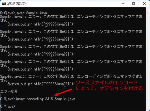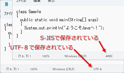 - Javaのソースファイルを保存するフォルダ「C:\java」を新規作成して開く - 「C:\java」 にソースファイル「Sample.java」 を新規作成して、上記のように入力・保存する - コマンドプロンプトを開き、カレントディレクトリを「C:\java」に変更する - 「javac Sample.java」でコンパイルする - 「java Sample」で実行する - 環境設定からサンプルプログラム実行までの 説明動画(音声なし) ![]() ・ソースファイルのエンコードに注意 - ソースファイルのエンコードによって、コンパイル時にエラーが出ることがあります - デフォルトのエンコードは UTF-8 - エディタによって、S-JIS(Shift-JIS) になっている場合があるので注意 <メモ帳で、UTF-8で保存されているものと、S-JIS(ANSI)で保存されているもの> ![]() - エンコードによるエラーが出る場合、コンパイルオプションをつければコンパイルできる ![]() |