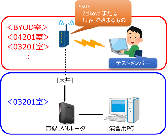 | 無線LANルータのNAT(またはNAPT)機能を使えるようにする。 まず、「テストメンバー」を1人決める やりたいことは ・無線LANルータのNAT機能を使えるようにする ・テストメンバーのPCから、演習用PCにある test.html をブラウザで表示する です ・無線LANルータ(WSR-1800AX4S)の取扱説明書 --> PDFファイル(12.1.MB) ![]() (1) 無線LANルータのNAT機能を使えるようにする ・無線LANルータで設定するとき、「NAT」とは異なる名称で扱われている可能性がある ・演習用PCのWiFi機能は使用しない ・演習用PCのIPアドレスは、固定IPアドレス(下図)にする ![]() ・その他の設定は適宜設定すること (2) テストメンバーは WiFi(以下を参照)に接続して、インターネットが使える状態にする Buffalo無線LANルータのWiFiに接続するのではないので注意 ※PCのWiFi接続を「ゼルコバ」にしていると、正しく表示されない可能性があります その時は、下記のSSIDに接続しなおして試してください SSID fuip-JG2,fuip-JG3,fuip-JA2,fuip-JA3 など fuip-で始まるどれか PASS fuip123・・・9 (3) テストメンバーのPCのブラウザで、test.html を表示する ・テストメンバーのPCで、test.html をブラウザで表示できればOK ・テストメンバーのPCのブラウザで、http://163.145.136.???/test.html を指定する ・???は、自分のグループで設定している数値を設定すること <完了したら、先生を呼んでチェックしてもらうこと> |