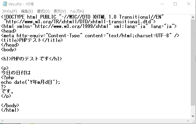 | XAMPPでPHPを利用して、ブラウザで以下の指示に従って結果を表示する ※設定は「3.Apacheのドキュメントルートを変更する」のまま続けること (1) 下記の「day.php」をテキストエディタで打ち込み、作成しなさい ![]() (2) 「day.php」の実行結果をブラウザで表示しなさい ・ただし、ブラウザにURL http://localhost/php/day.php を指定したら開くようにすること ※URLに「/php/」が入っていることを忘れずに ・ブラウザで今日の日付が表示されたらOK <完了したら、先生を呼んでチェックしてもらうこと> |