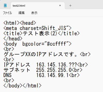 | Apacheのドキュメントルート・ディレクトリ(フォルダ)を変更しなさい (1) 下記の「test2.html」をテキストエディタで打ち込み、作成しなさい XXや???は自分のグループに合わせた数値を入れること ![]() (2) ディレクトリ「c:/www」を新規に作成して「test2.html」を「c:/www」に移動しなさい (3) XAMPPのApacheでドキュメントルートディレクトリを「c:/www」に変更する (4) ブラウザにURL http://localhost/test2.html を指定して表示できたらOK <完了したら、先生を呼んでチェックしてもらうこと> |