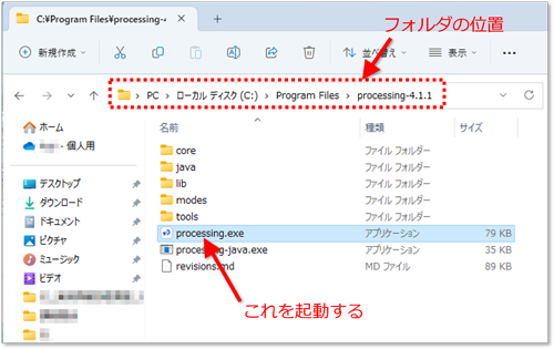 Processingとは - Processingは、基本的に Javaの仕様・文法 でソースを作成する (基本的に文法はJavaだが、pythonも利用可) - Javaの文法に加え、Processing独自(グラフィックス、3DCG描画、マウス操作など)の機能が追加されている - 視覚的なフィードバック(グラフィックス)が容易に得られるプログラミング言語・統合開発環境 - 初心者がプログラミングを勉強するのに適している、お勧め! - 無料で使えます ![]() ・ 自分のPCでもProcessingを利用できます - 自分のPCに Processing をインストールしましょう ・ Processingのインストール - ここからダウンロード --> https://processing.org Windows, Mac, Linux は自分の環境に合わせる ![]() ※お金を払う必要はありません - ダウンロードした *.zip ファイルの中にあるフォルダ「processing-4.*」をまるごとどこかに解凍する 「C:\Program Files」への解凍を推奨 「C:\Program Files\processing-4.*\」の中にある、実行ファイル「processing.exe」のショートカット をデスクトップなどに作成しておくと、起動が簡単になる - Processingのアンインストールは、フォルダ「processing-4.*」をまるごと削除するだけです レジストリへの書き込みはないので、削除も簡単です |