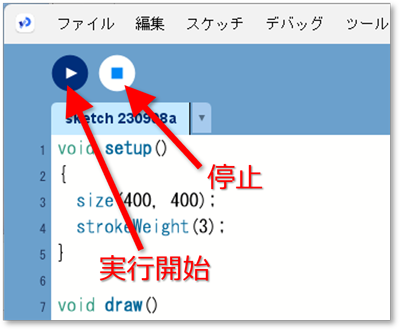 | ・ Processingの起動 - 以下の実行ファイル「processing.exe」をダブルクリックしてProcessingを起動する ![]() ・ プログラムの実行と停止 ![]() - 以下のプログラムを打ち込んで実行してみましょう <円を描く>