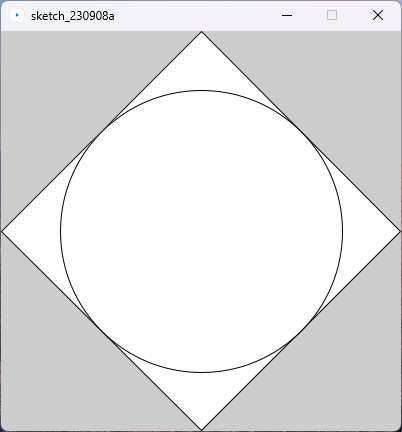 <演習1> 下図を描画しなさい。 - 画面のサイズは 400x400 - 四角形(正方形)を描画して、次に円を描画する - 円の半径は 100x√2 ![]() 解答例 |