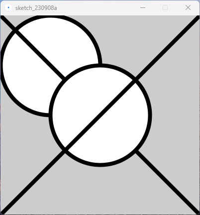 <演習3> 下図を描画しなさい。 Windowのサイズは 400x400, 2個の円の中心座標は(0,0), (400,0)であり、 円の直径は800である。(円は ellipse();で描画) 色について、左は青、右は赤で α値=128 を設定する。 ![]() 解答例 |