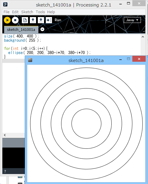 - size(400,400); //ウィンドウサイズを400x400 にする - background(255); //背景を白色にする - ellipse(200,200,40,40); //円を描画する ![]() <繰り返しを使って同心円を描画する例> ![]() ・ エディタの文字サイズを変更するには エディタの文字サイズを変更することができます。 メニューの [ファイル] --> [設定...] で、下記の「エディタフォントサイズ」を適宜変更してください。 ![]() |