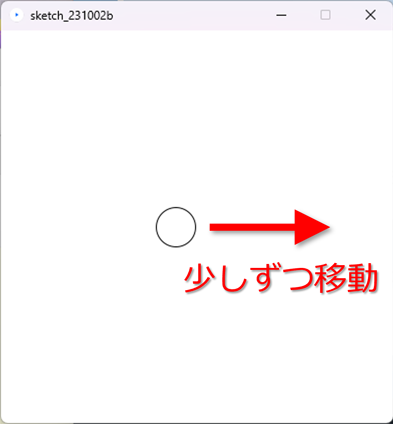 1秒間に、x は 60増加することになる <実行結果> ![]() <演習2> 上記のプログラムを、「〇が右端から左方向へ移動する」ように修正しなさい。 ![]() 解答例 <例:〇が少しずつ大きくなる>