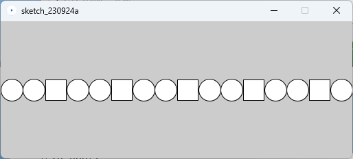 下図のように、3個ごと(左から3の倍数の位置)に□、それ以外は〇を描きなさい。![]() ※以下の□と〇を描画するプログラムを参考に考えること。 □を16個描画するプログラム