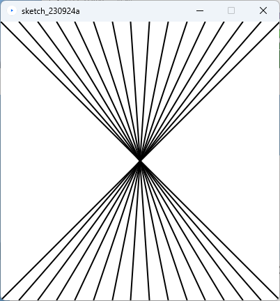 | 下図の描画をしなさい。 線と線の交点は長い方の線の中点として、線の本数は全部で10本である。 for文を使うこと。 ![]() |