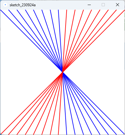 ![]() このプログラムを下図のように青色と赤色で半分ずつになるように修正しなさい。 青色は stroke(0,0,255); 、赤色は stroke(255,0,0); で指定する。 ![]() |