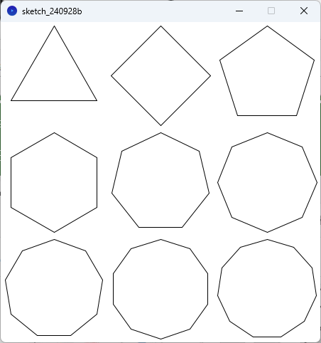 ![]() このプログラムを参考にして、下図のように正三角形〜正11角形を3x3の配置で描画しなさい。 ウィンドウのサイズは 450x450 とする。 ![]() |