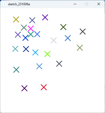 | <演習1>の400個の〇を描くプログラムを、色もランダムになるように修正しなさい。 <実行例> ![]() |