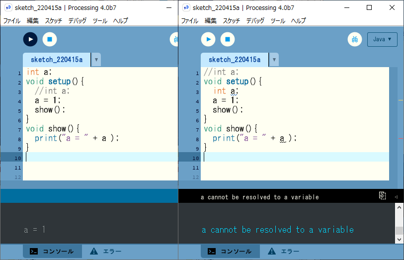 ・変数の宣言位置についての注意 - 変数を宣言する場所に気をつけること(変数のスコープ) - 下図で、左図はOKで、右図はNG。違いを確認しよう // を記述すると、それより右側はコメントとなる ![]() |