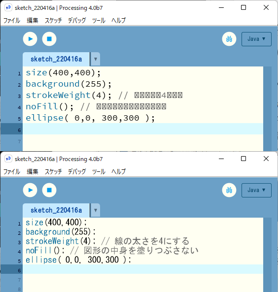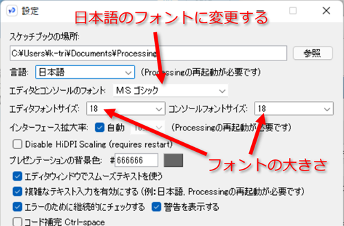 <注意> ・ Processingのエディタで、日本語が文字化けする人は [ファイル] --> [設定] を開き、下記の部分を変更してください。 ![]() 下の図で、上図は文字化け、下図は日本語が正しく表示されているものです ![]() |