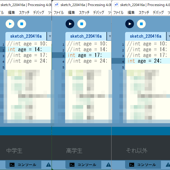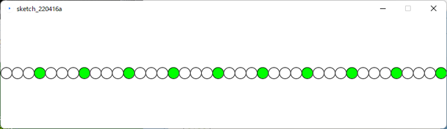 <実行例> 左から age=14,17,24で実行 <演習7> 下のソースは、〇を横並びで40個描画するプログラムである。〇は左端から右に描画している。 4の倍数の位置を緑色に描画するように、このプログラムを修正しなさい。 <ソース>