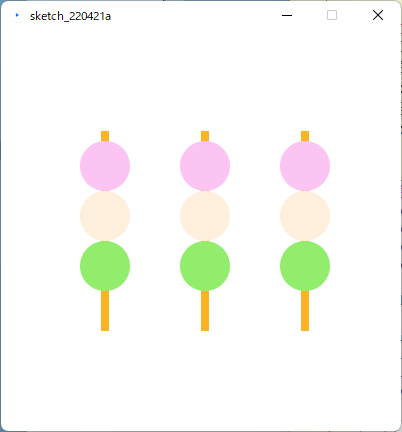 <実行結果> <演習3> 下のソースは三色だんごを3本描画するプログラムである。まずはソースをコピペして実行してみなさい。 (※PDFからコピペすると、目に見えない文字が入りエラーが表示される可能性がある、そのときは手入力で修正する) このソースを (1)三色だんご1本を描画する関数 drawDango(int x) を作成する (2)drawDango(int x) を3回呼び出して3本描画する のように変更しなさい。 なお、drawDango(int x) の int x は三色だんごの横の位置座標を指定する引数とする。 <ソース>