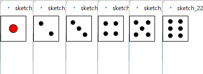 <実行結果> <演習4> 下のソースでサイコロを描画する関数 drawDice(int n); を作成しなさい。 引数 int n はサイコロの目の数とし、1~6を指定できるものとする。 /*空欄(複数行)*/を埋めて完成させなさい。 なお、サイコロのサイズは 50x50 とする。〇のサイズは、見た目がそれっぽいものにすること。 <ソース>