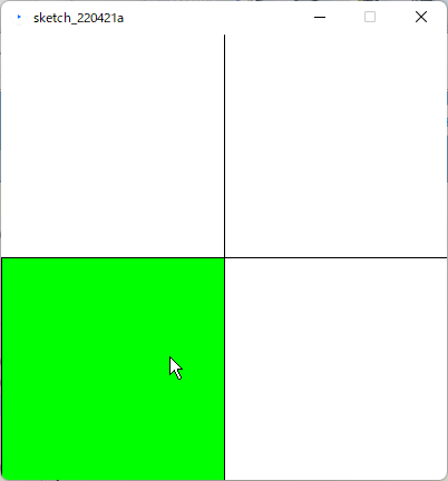 <演習6> 画面を4分割して、マウスボタンを押している間、マウスポインタのある領域の色を緑色にする。 下記のソースの/*空欄(複数行)*/を埋めて完成させなさい。 ※ヒント Processingの変数 mouseX,mouseY,mousePressed を使う <ソース>