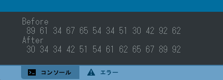 <実行例> <演習3> int [] x = {89,61,34,67,65,54,34,51,30,42,92,62}; を昇順に並び替えて表示する。 (Lesson7のSample9.javaを参考にすること)--> 切り抜きの画像 以下ソースの /*空欄(複数行)*/ および /*空欄*/ を埋めて、プログラムを完成させなさい。 <ソース>