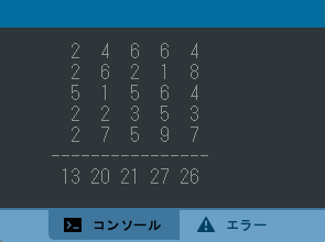 <実行例> <演習5> 整数の乱数(1~9)を発生させて、配列 int [][] r = new int [5][5]; に格納し、それらを表示する。 また、実行例のように縦の列の合計を計算して表示する。 以下のソースの /*空欄(複数行)*/ を埋めてプログラムを完成させなさい。 (.lengthの使用はどちらでもよい) <ソース>