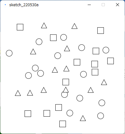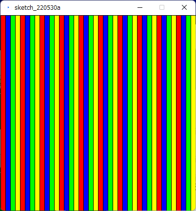 <実行例> <問題3> 実行例のように、4色(赤青緑黄)周期のタテのしま模様を描画しなさい。 1色のヨコ幅は10ピクセルである。 <実行例> <問題4> マウスをクリックした位置に、△〇□のどれかをランダムに描画する。 以下のソースの /*空欄(複数行)*/ を埋めてプログラムを完成させなさい。 <ソース>