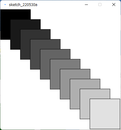 <実行例> <問題5> 100x100のサイズの□を対角に10個描画しなさい。 実行例のように、色はグレイスケールのグラデーションにする。 以下のソースの /*空欄(複数行)*/ を埋めてプログラムを完成させなさい。(第1回課題4を参考に) <ソース>