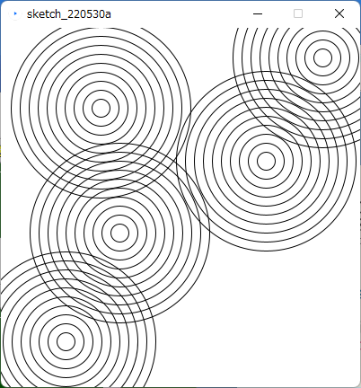 <実行例> <問題6> マウスをクリックした位置を中心に10個の同心円を描くようにしなさい。 下図の実行例は5箇所でマウスをクリックした例である。 最も大きな円の直径は200である。 下記のソースの/*空欄(複数行)*/を埋めてプログラムを完成させなさい。 <ソース>